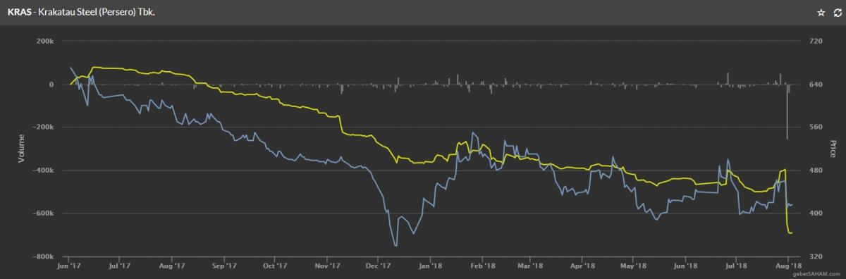 Jika dicermati grafik saham KRAS pada tanggal tersebut, sesungguhnya apa yang sedang terjadi sangat menyeramkan. Grafik volume sangat jelas merupakan pola distribusi, bahkan pada tanggal 31 Juli 2018 sedang terjadi penjualan besar-besaran, garis kuning menukik tajam. Para pelaku pasar nyata-nyata ingin melepas/menjual saham, kemudian dihembuskanlah berita bagus agar para investor mainstream berbondong-bondong membeli. So, berita seperti ini adalah jebakan betmen!
